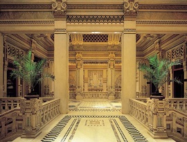 Groups of three odalisques, with their elegant and sly poses, ceilings painted with peacock tails, columns, capitals and bases recall the Rajah of India and its mountain temples, while quite strong is the imprint of ancient Assyrian world, with its lions, anthropomorphic figures and bas-reliefs.